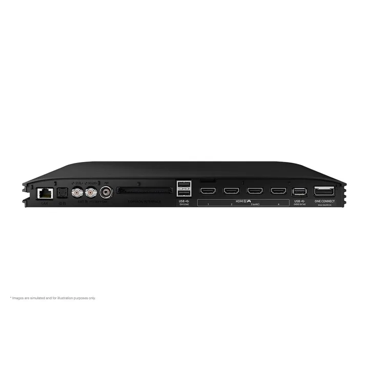 De aansluitingen van de QN800D zitten in een aparte box die Samsung de One Connect noemt. Hiermee kun je alle HDMI-beeldbronnen aansluiten, bijvoorbeeld een blu-rayspeler en spelcomputer, maar ook USB-media. Hij is tevens voorzien van een digitale audio-uitgang.