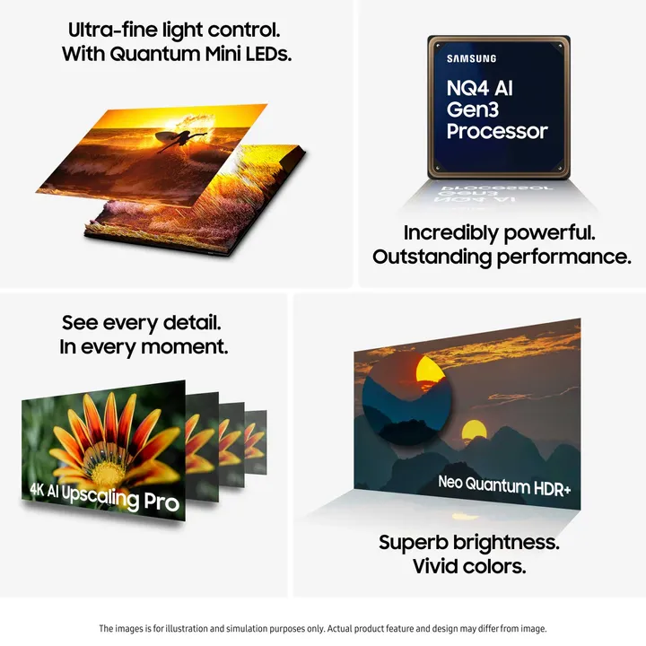 Neo QLED beeldverwerking met de geavanceerde NQ4 AI Gen3 processor werkt in real-time om de beeldkwaliteit scène voor scène te optimaliseren. De technologie herkent objecten, texturen en details in het beeld en met behulp van AI-upscaling past de processor op intelligente wijze kleur, contrast en scherpte aan om zelfs inhoud met een lagere resolutie een aanzienlijke boost te geven. Een indrukwekkende verbetering van de ervaring, of je nu oudere films, tv-programma's of streaming in wisselende kwaliteit bekijkt.