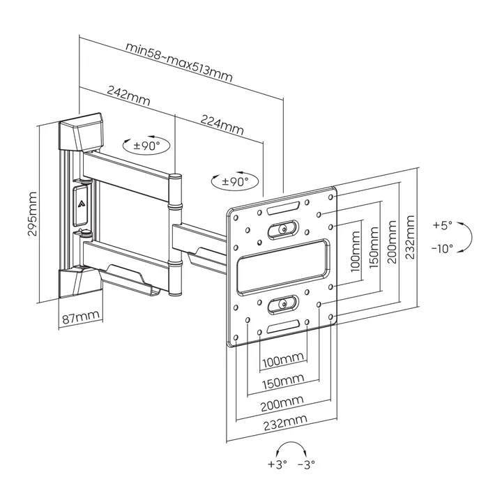 Essentials TVB Motion Small 58 – draaibare VESA universele muurbeugel voor TV’s van 22 tot 43 inch.