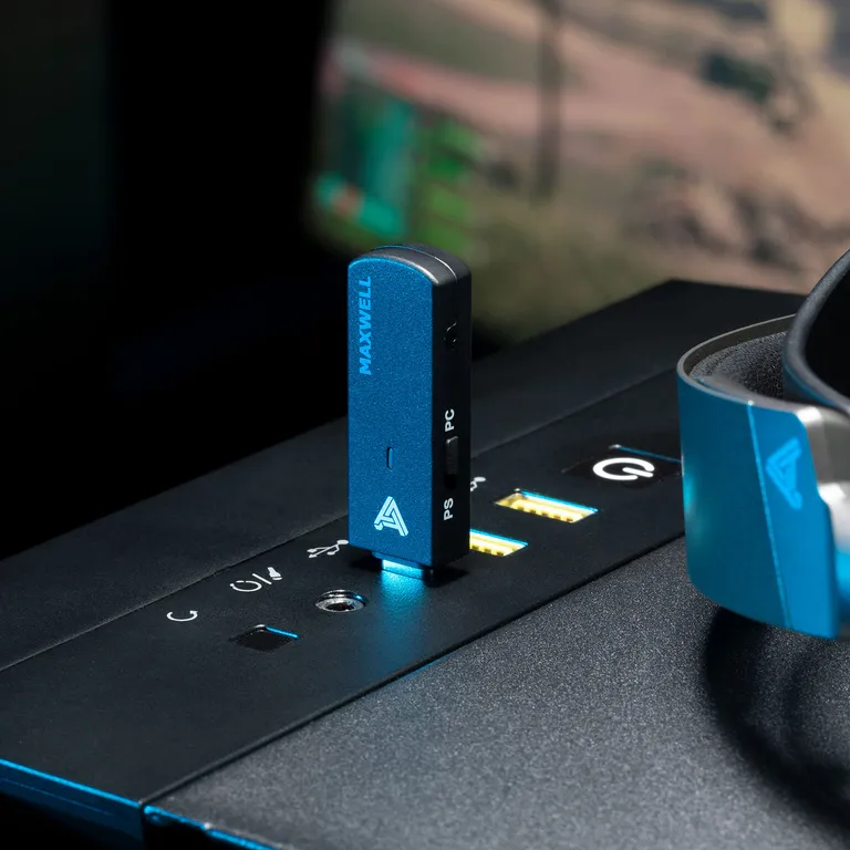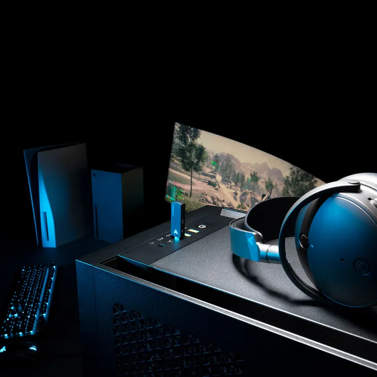 De Audeze Maxwell wordt geleverd met een kleine Wi-Fi-dongle die je in een USB-C-poort van de computer of spelcomputer stopt. Dan krijg je een schitterend draadloos geluid – natuurlijk zonder latency, waardoor het beeld en geluid altijd 100% synchroon lopen. Geen compromissen dus, ook niet als je draadloos gamet!