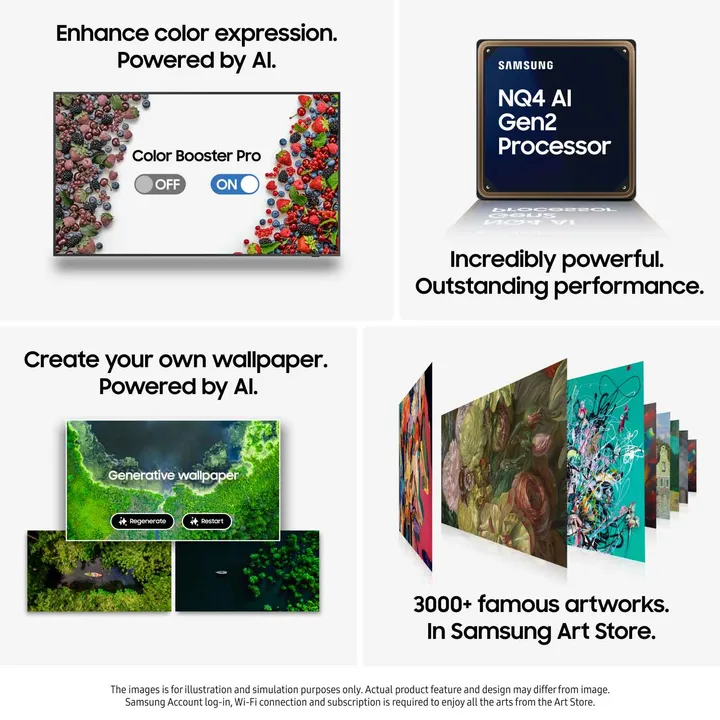 Samsung The Frame wordt standaard geleverd in een zwarte afwerking (Black), en met een eikenhouten frame maar je kunt frames in verschillende kleuren en stijlen kopen (optioneel). Inclusief een Bluetooth gebaseerde SolarCell Remote met zonnecellen. De zonnecellen werken zelfs in huiskamerverlichting, waardoor zowel jij als de natuur worden gespaard van onnodige batterijen.