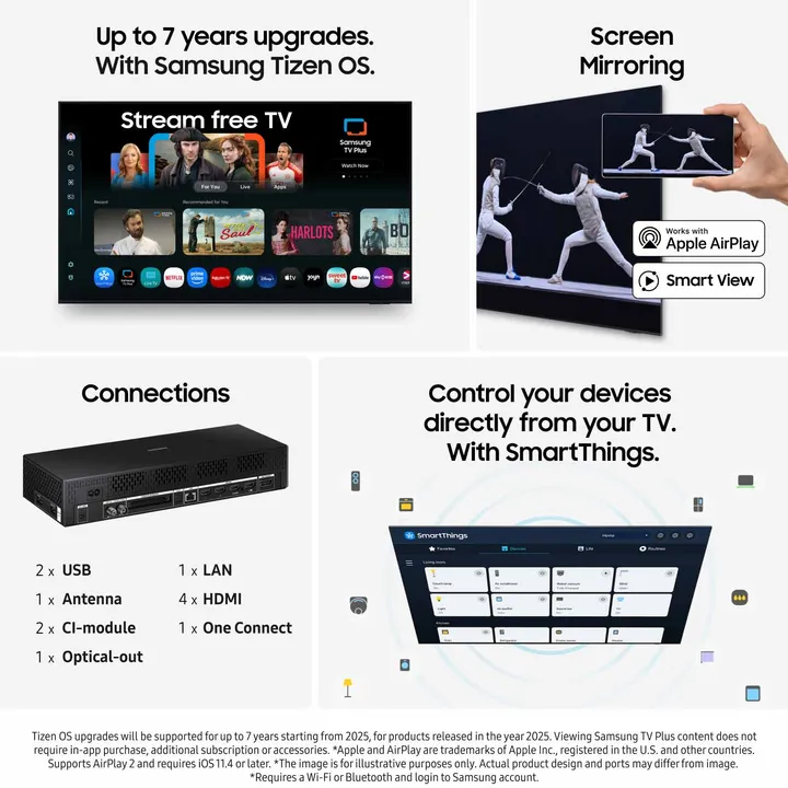 The Frame is uitgerust met Samsung's eigen Smart TV platform Tizen, waardoor je een snelle en intuïtieve ervaring hebt met bliksemsnelle toegang tot Netflix, Disney+, YouTube en andere populaire diensten. Je kunt de tv met je stem bedienen via de microfoon van de afstandsbediening (Amazon Alexa) of een aparte slimme speaker (Google Assistant), en met Multi View kun je zelfs het scherm splitsen en twee dingen tegelijk bekijken.