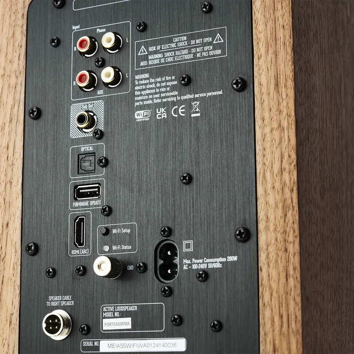 De versterkermodule in de ene luidspreker heeft vier kanalen van ieder 80 watt die elektronisch worden verdeeld over de verschillende speakers. En alhoewel dit natuurlijk niet is te vergelijken met 80 watt continu uit een traditionele high-end stereoversterker, merk je wel dat dit vermogen bijdraagt aan het goede geluid van de FORTE A55 WIFI.