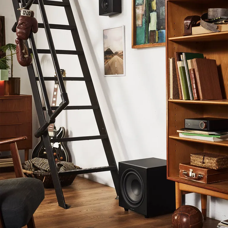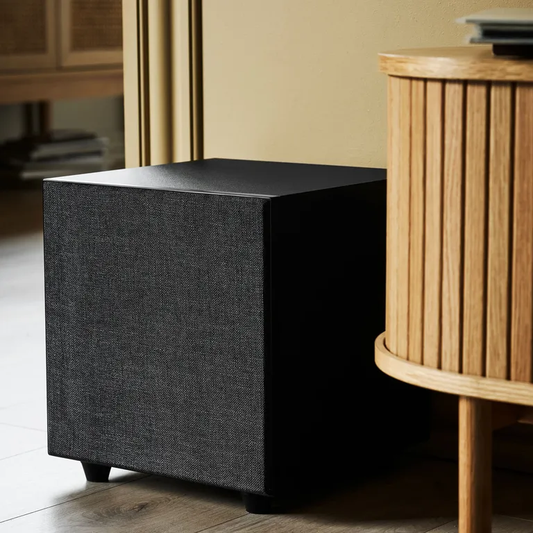Onze oren kunnen de richting van lage tonen niet echt goed bepalen, en dus maakt het niet zoveel uit waar je de MALMÖ SUB 10 neerzet. Als je hem bijvoorbeeld in een hoek zet, krijg je nog wat extra bas, zonder de subwoofer extra te belasten. Een subwoofer die in een hoek staat, levert namelijk nog meer geluidsdruk omdat het geluid akoestisch versterkt wordt door de wanden en de vloer. En omdat de baspoort naar beneden is gericht, kun je hem echt overal kwijt. Probeer het zelf maar en zet de subwoofer neer waar hij het beste klinkt.