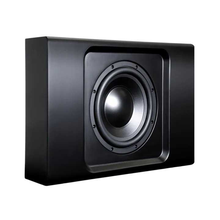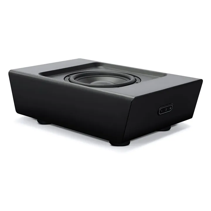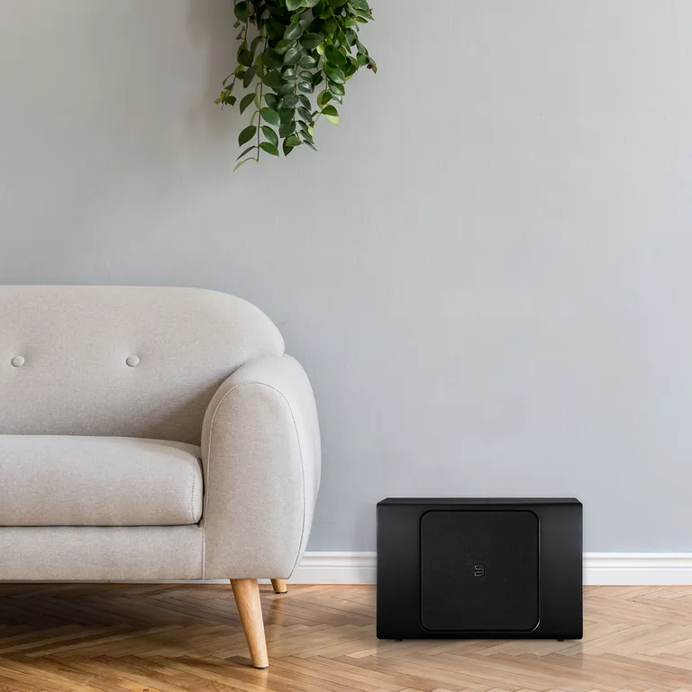 De Bluesound PULSE SUB+ is uitzonderlijk compact voor een subwoofer, en dankzij het platte ontwerp kun je hem flexibel plaatsen – bijvoorbeeld liggend onder een bank of hangend aan de muur (muurbeugel inbegrepen).