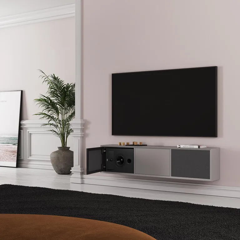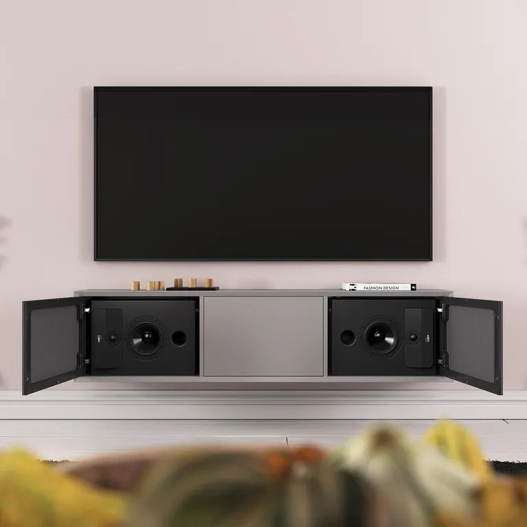 - Ontworpen voor horizontale plaatsing in TV-meubel (achter stoffen deurtje)